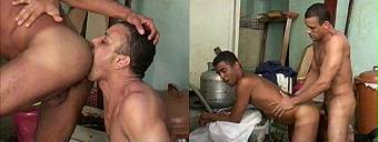This is No Time to be Serious!The kitchen is the scene of the next chapter where Symao seduces Bruno while washing dishes. The suck-fest begins with both dark and muscular men slurping and swallowing. Then they plow each other's bubble ass until white cum spurts all over their beautifully dark and hard bodies. |