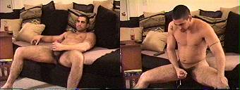 GOOD DAYS,BAD DAYSWhen Zack returns he's a little more sedate!? He's beefed-up since the last visit and stripped down you can see his sexy tattoos and beautiful hairy legs. Zack shows off his body and hams it up for the camera as he strokes his cock to the porno (Zack thinks he's gonna be a big Porno Star and make lots of $$). Off camera I take out my cock and we joke about our different sizes - Zack is 8'' X 5'' and I am 9'' X 6'' - He's impressed! After lubing up and coming close several times he sits on the edge of the sofa and launches a dozen spurts of creamy white CUM. This is one Wild and Crazy Guy! |